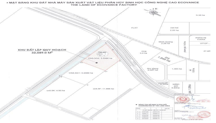 Dự án “Nhà máy sản xuất vật liệu phân huỷ sinh học công nghệ cao” của Công ty TNHH... Việt Nam được thực hiện tại lô đất ..KCN Đình Vũ, thuộc Khu kinh tế Đình Vũ – Cát Hải, phường Đông Hải 2, quận Hải An, thành phố Hải Phòng trên diện tích 32.089 m2 theo nội dung hợp đồng thuê đất số DVIZ/SM/CON/23/24 ký ngày 13/12/2023 giữa Công ty cổ phần Khu công nghiệp Đình Vũ và Công ty TNHH... Việt Nam. Toàn bộ diện tích dự án nằm trong khu hoá chất – hoá dầu của khu công nghiệp Đình Vũ. Do đó, vị trí của dự án phù hợp với phân khu chức năng và nằm trong quy hoạch của KCN Đình Vũ, được thể hiện trên sơ đồ trích lục bản vẽ mặt bằng KCN.