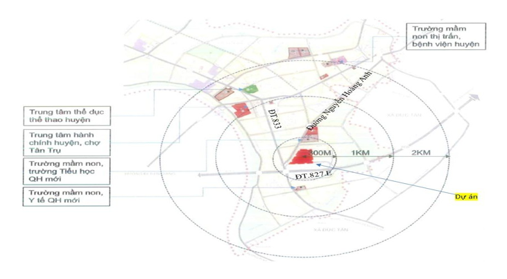 Dự án cách khu dân cư – trung tâm hành chính của xã Tân Trụ khoảng 1,2km về phía Bắc.